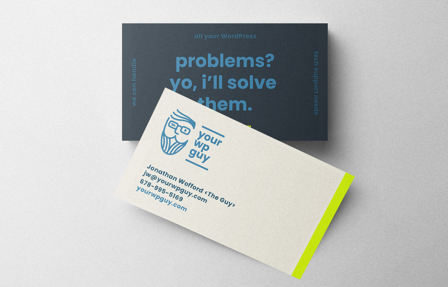 Your WP Guy needed a brand refresh with a goal of feeling friendly, reliable, and funny. Jonathan's distinctive facial hair was the focus of the rebrand with a good-friend vibe setting the tone and aesthetic.